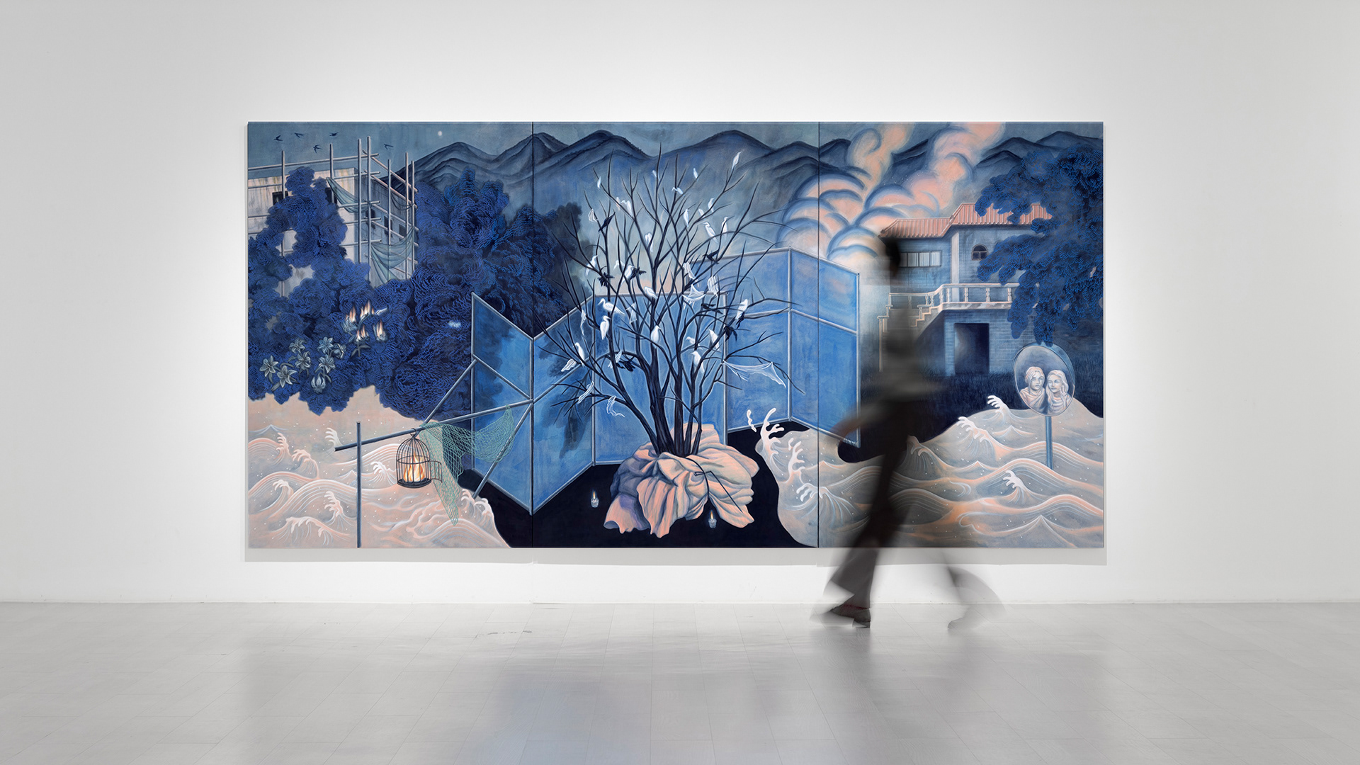 이번 전시에서는 그 징후를 드러내는 상징으로서 ‘불’을 사용했다. 촛불과 산불, 바다 위의 등불, 도시에서 번지는 화재처럼 우리 사회에는 ‘곳에 따라 불’이 존재한다. 나의 작업에서 불은 위로와 파괴, 희망과 경고가 동시에 얽혀 있는 상징물이 된다. 이것은 내가 줄곧 사용했던 '파도'와 맥락을 함께하며 자연이 인간에게 작용하는 이중적인 면을 뜻한다. 충주에서 지내는 동안, 아름답고 고요한 자연 경관에 감탄하면서도 늘 그 안쪽에 소멸의 기척이 함께 있는 듯한 느낌이 따라왔다. 허름하거나 부서진 집들, 공사가 중단된 폐건물, 무성히 풀이 자라나 가려진 구조물들이 능선이 아름다운 산과 함께 조화를 이루고 있었다.